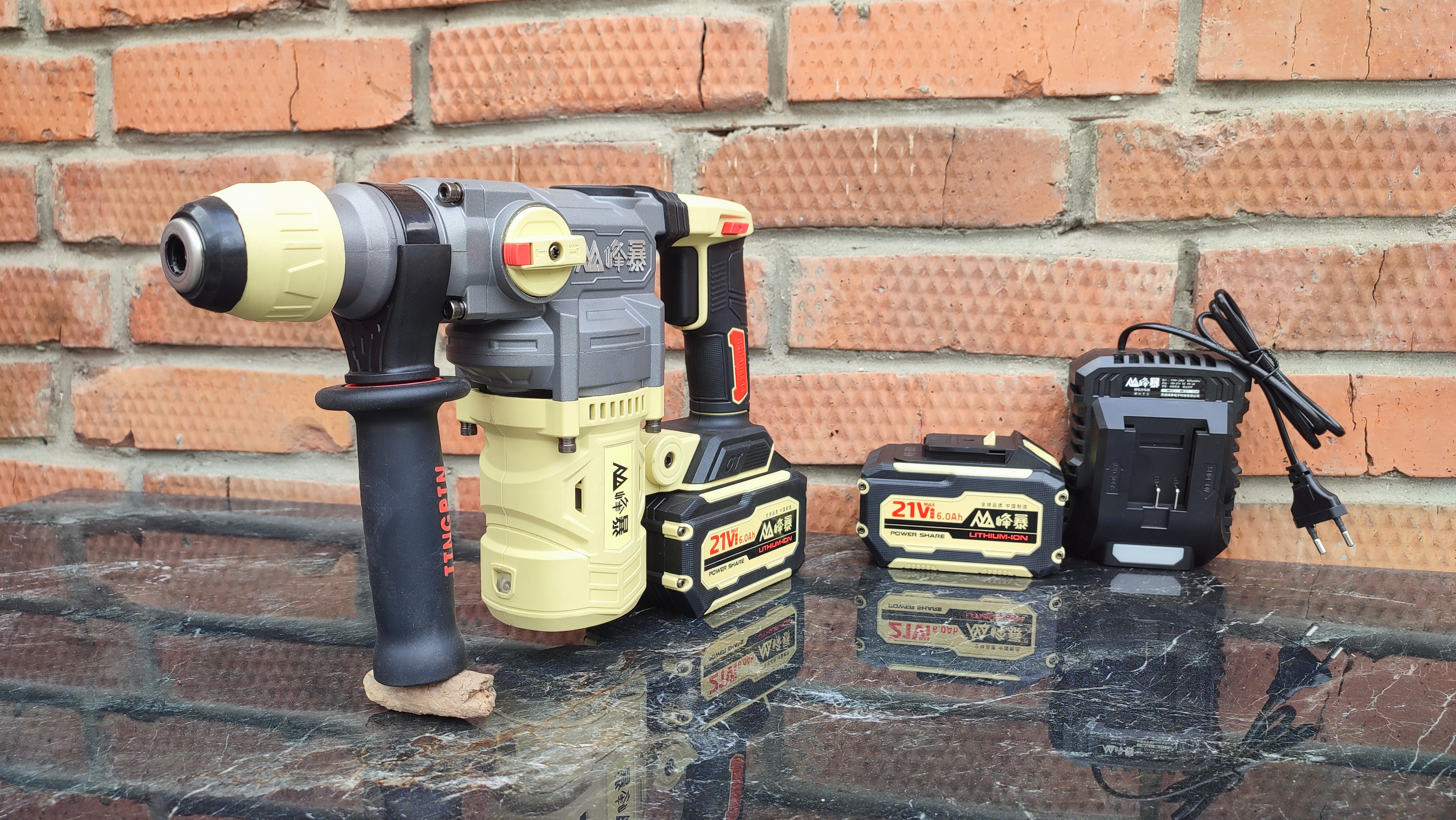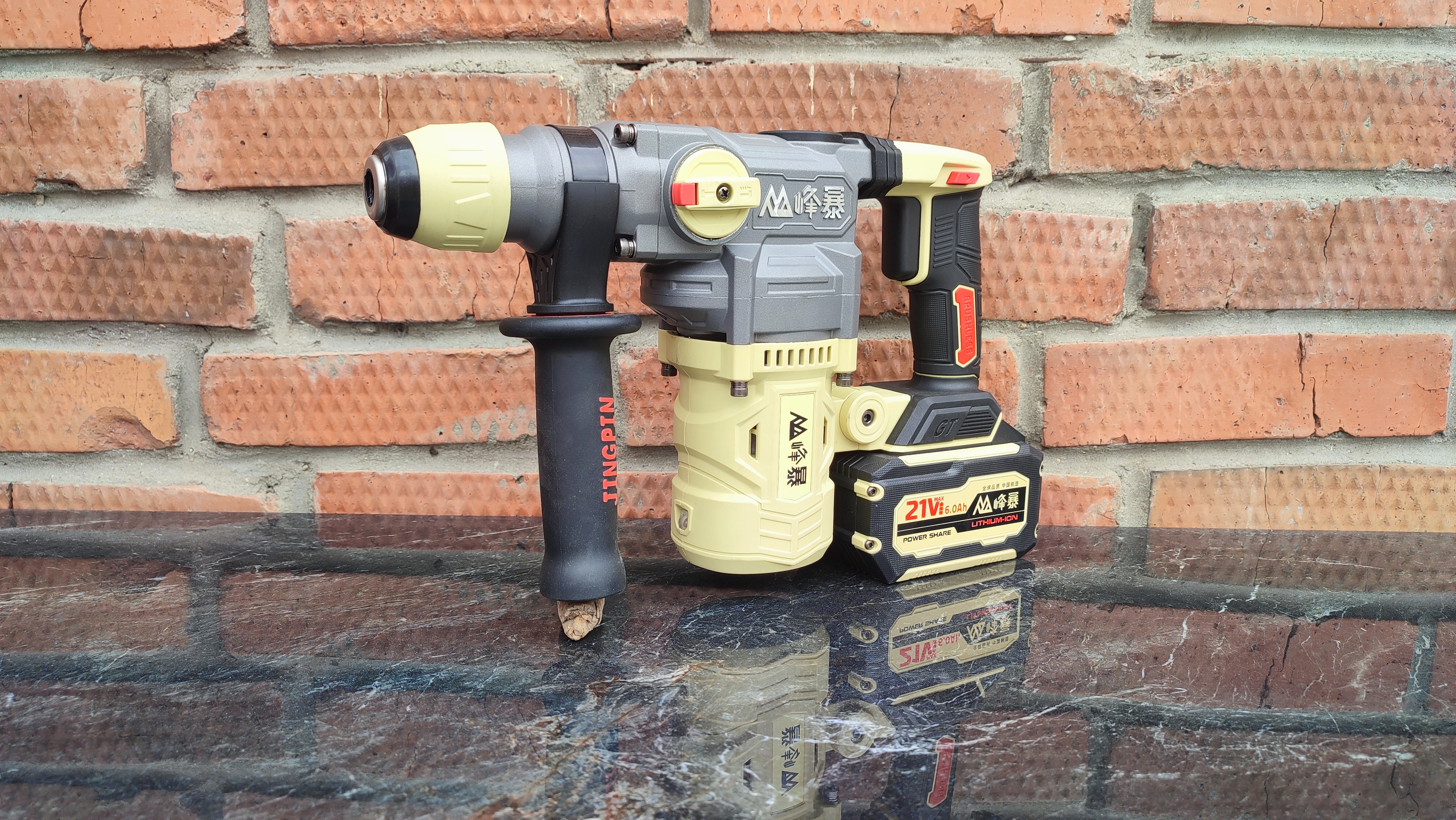 Перфоратор имеет подсветку рабочей поверхности, реверс и дополнительную рукоятку для удобства.