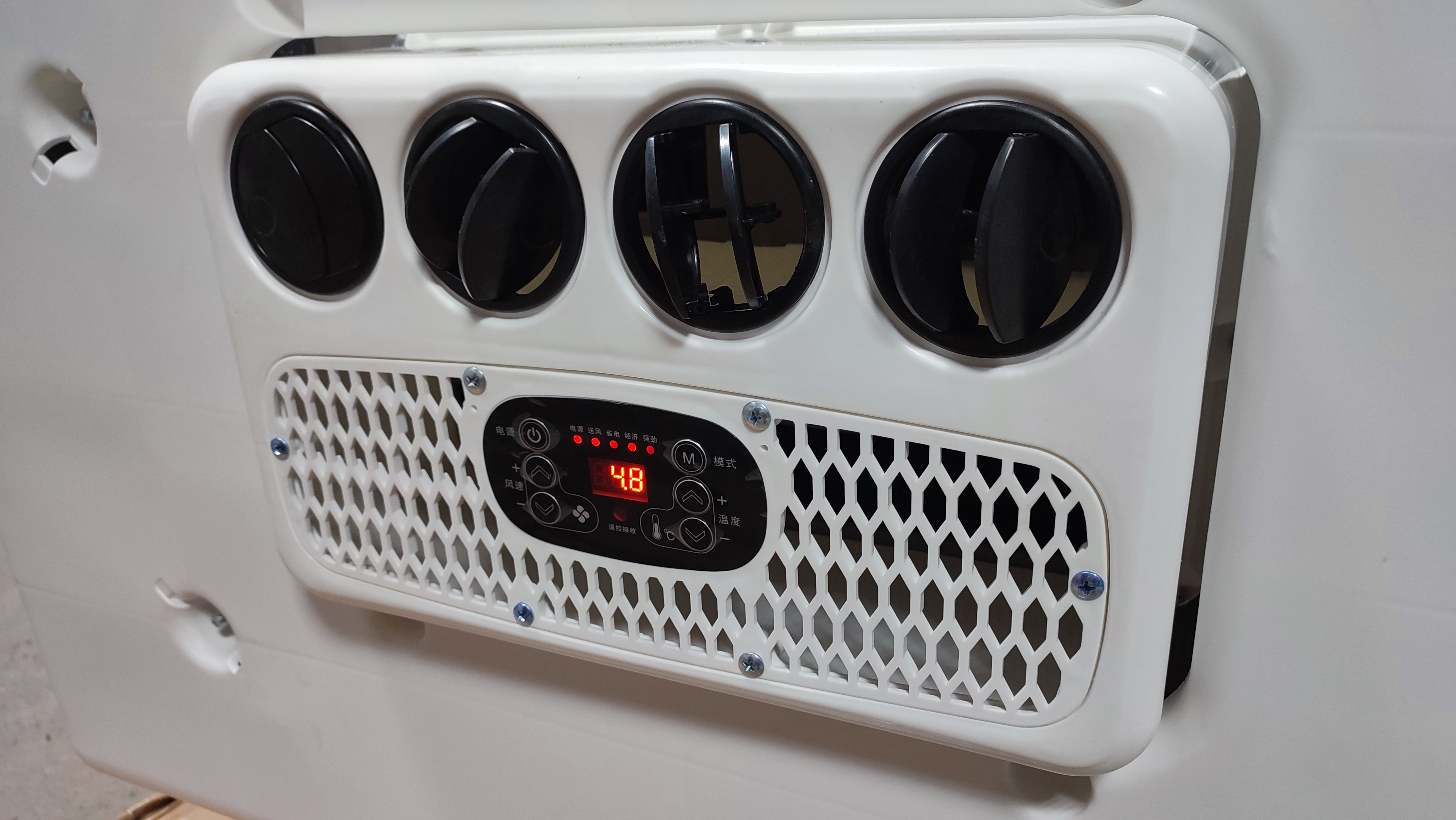 Плоский, обтекаемый корпус кондиционера гармонично сочетается с дизайном кабин современных грузовых автомобилей. Внутренняя панель выдержанная в цветовой гамме потолка кабины не вносит диссонанс в интерьер кабины.