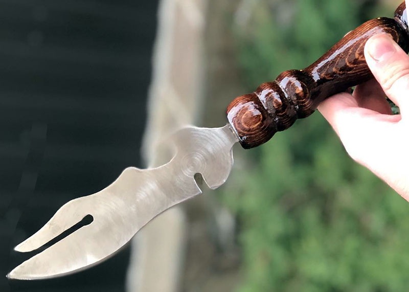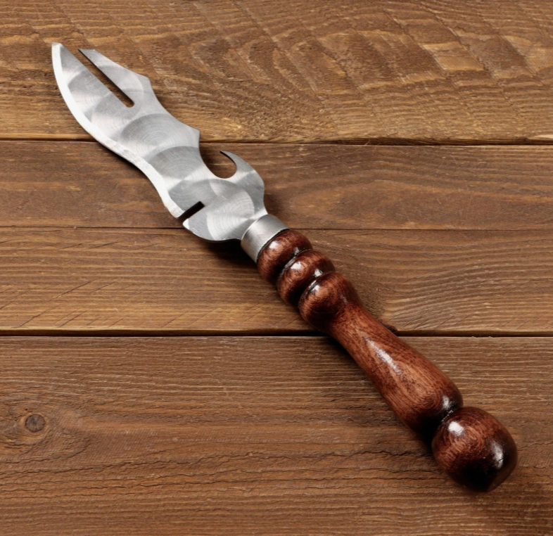 Нож-вилка - это универсальный нож для шашлыка, который обеспечит быстроту и удобство приготовления блюда. Длина шашлычного ножа - 30 см. Ширина клинка - 4.5 см. Толщина стали - 2 мм. Многофункциональный универсальный прибор включает в себя: