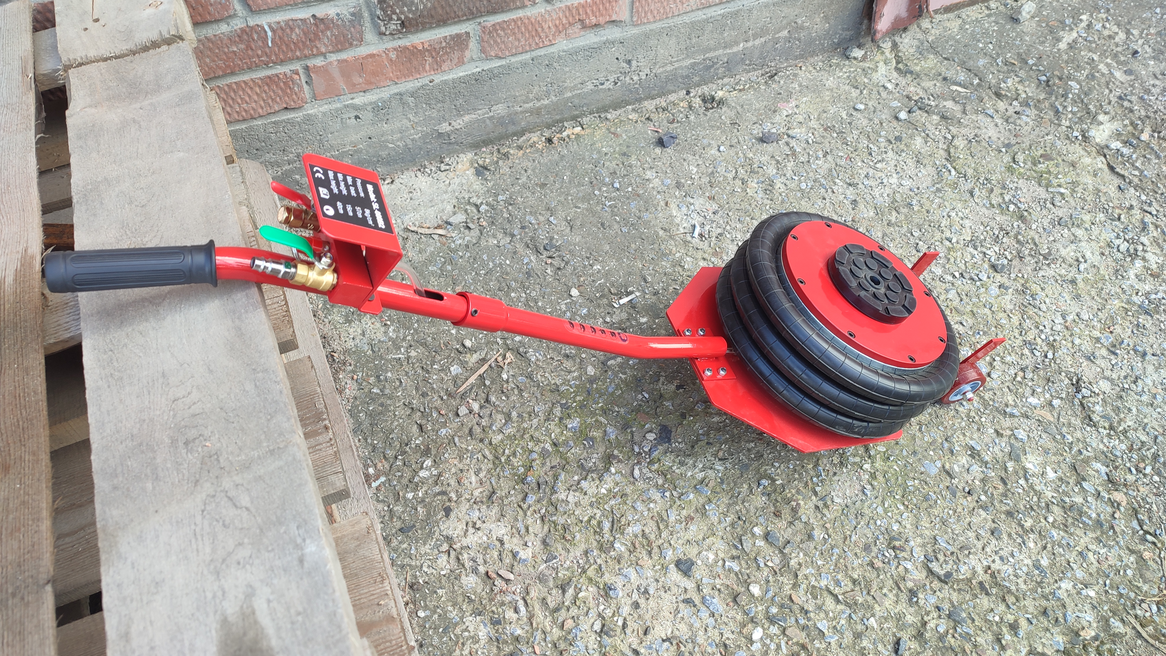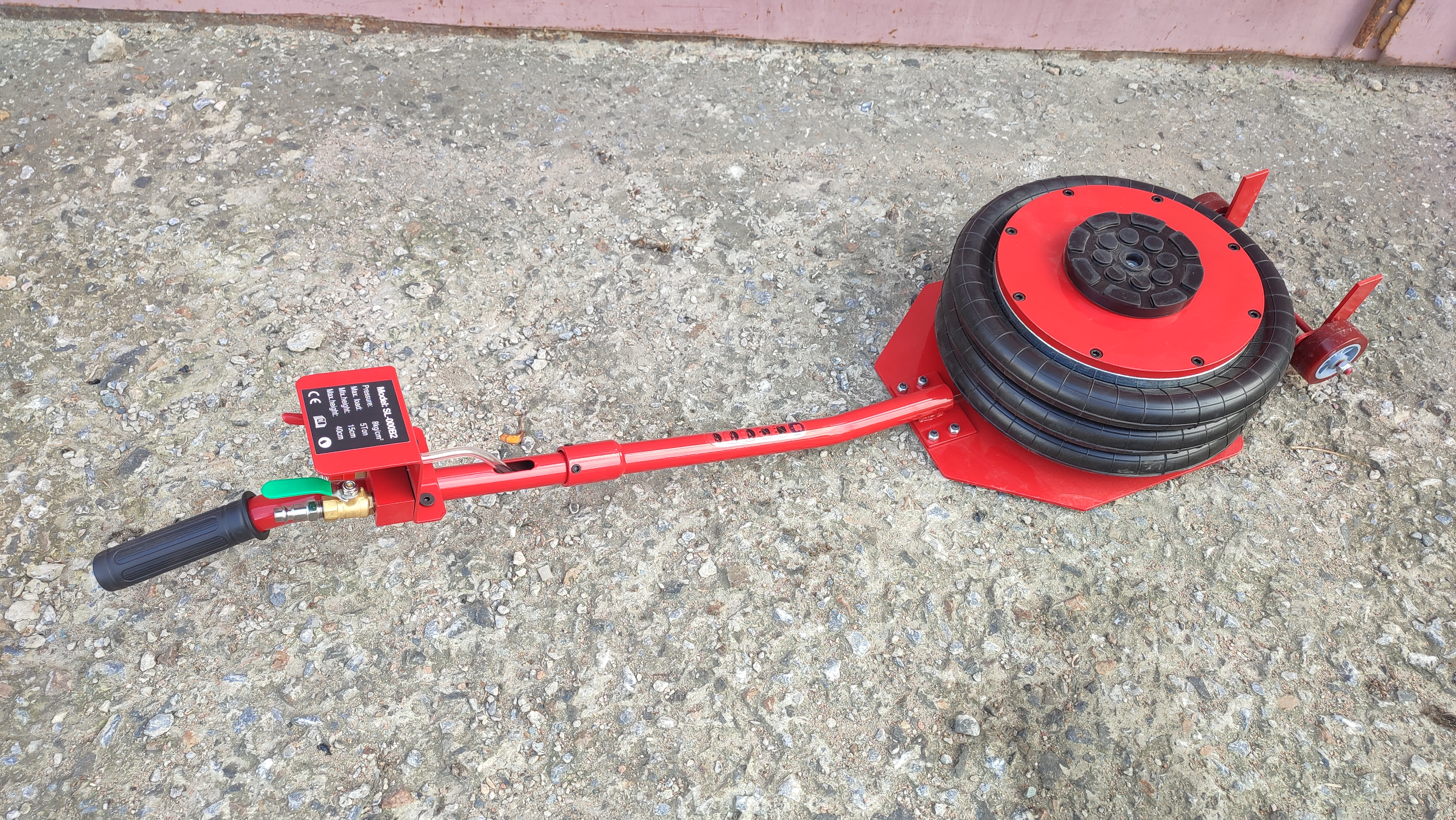 Устройство приводится в действие путем открытия крана подачи, расположенного на конце управляющей рукоятки. Конструкция данной модели включает три распорные резиновые подушки диаметром 310 мм. Если домкрат применяется в процессе ремонтных работ, поднятую сторону автомобиля следует зафиксировать при помощи дополнительных опор.